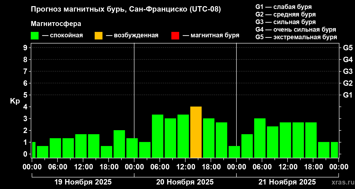 Прогноз магнитных бурь Сан-Франциско — 19 ноября 2025 года