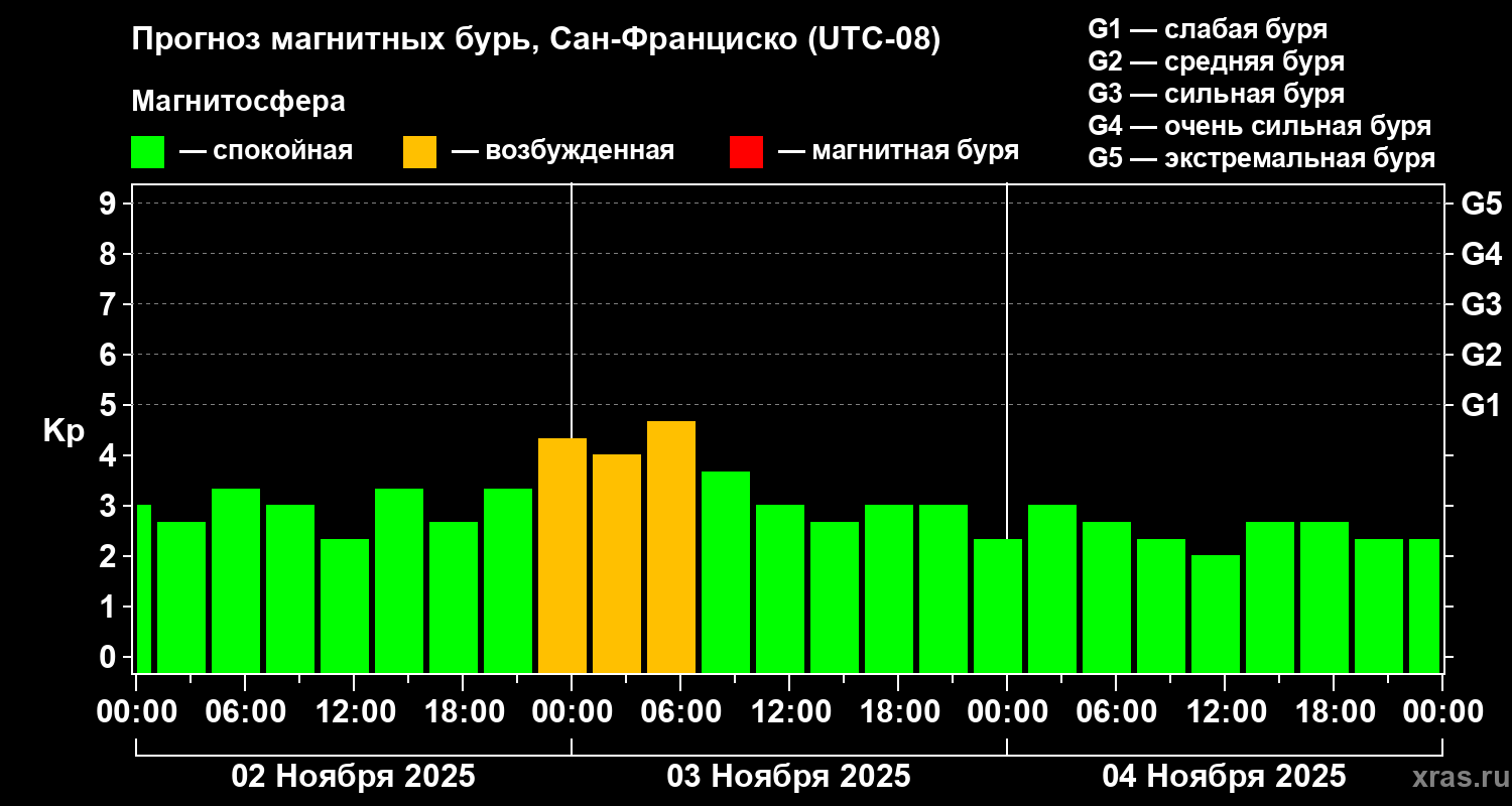 Прогноз магнитных бурь Сан-Франциско — 2 ноября 2025 года