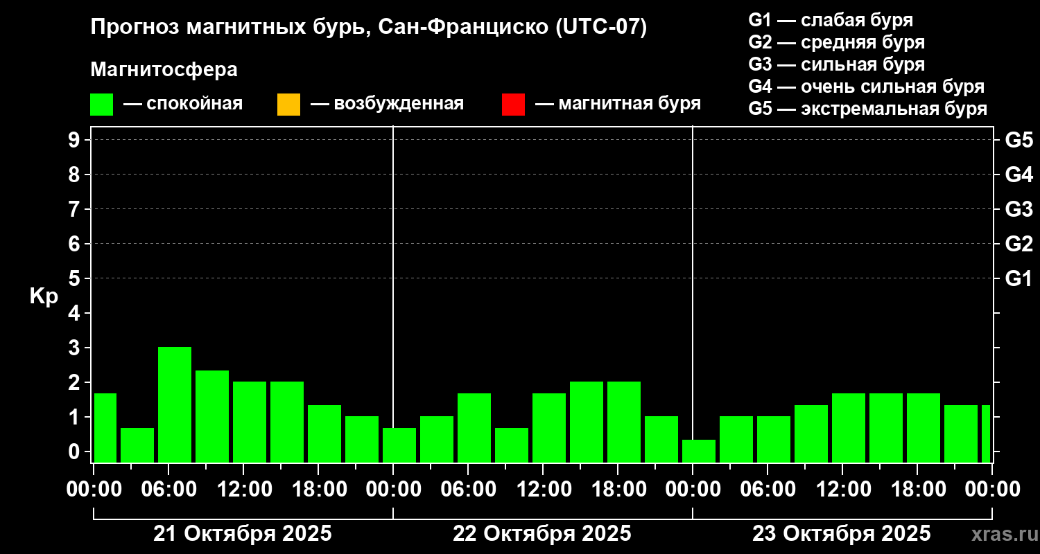 Прогноз магнитных бурь Сан-Франциско на 21 октября 2025 года