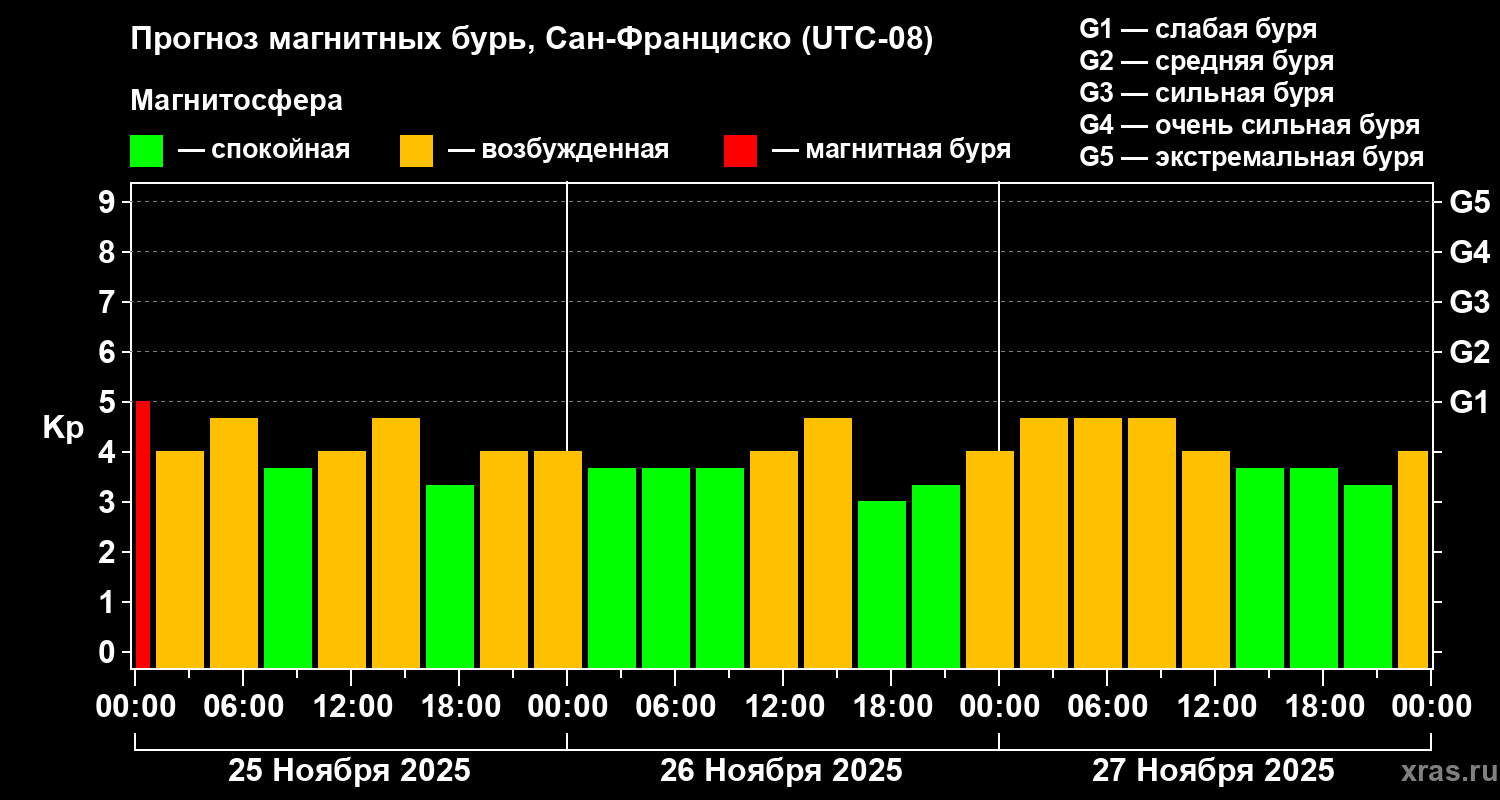 Прогноз магнитных бурь Сан-Франциско — 25 ноября 2025 года