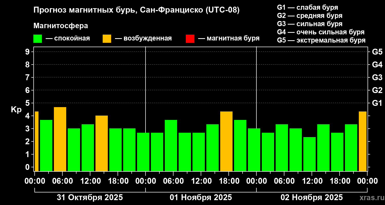 Прогноз магнитных бурь Сан-Франциско на 31 октября 2025 года