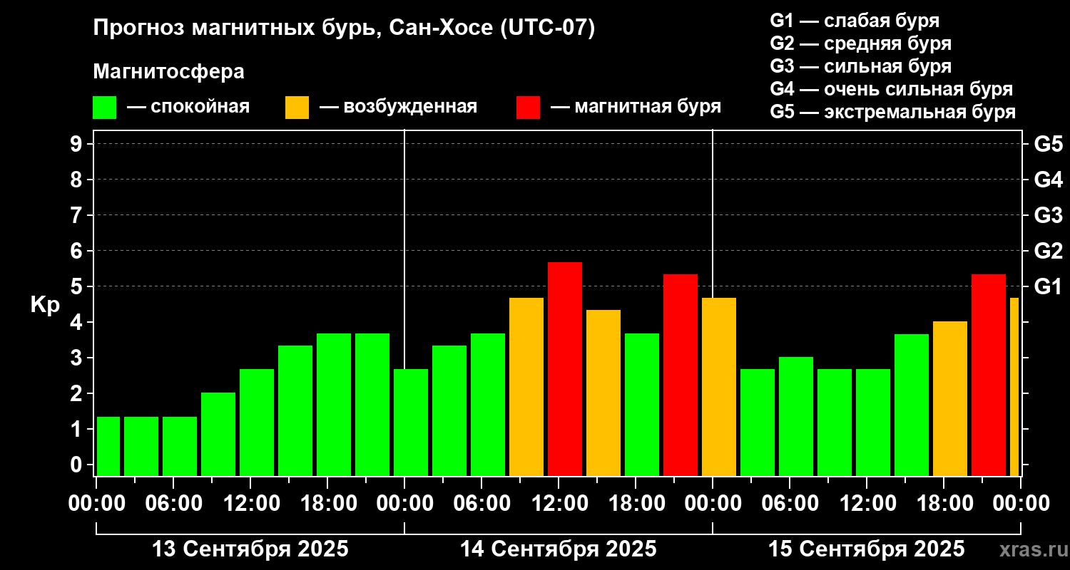 Прогноз магнитных бурь в Сан-Хосе на 13 сентября 2025 года