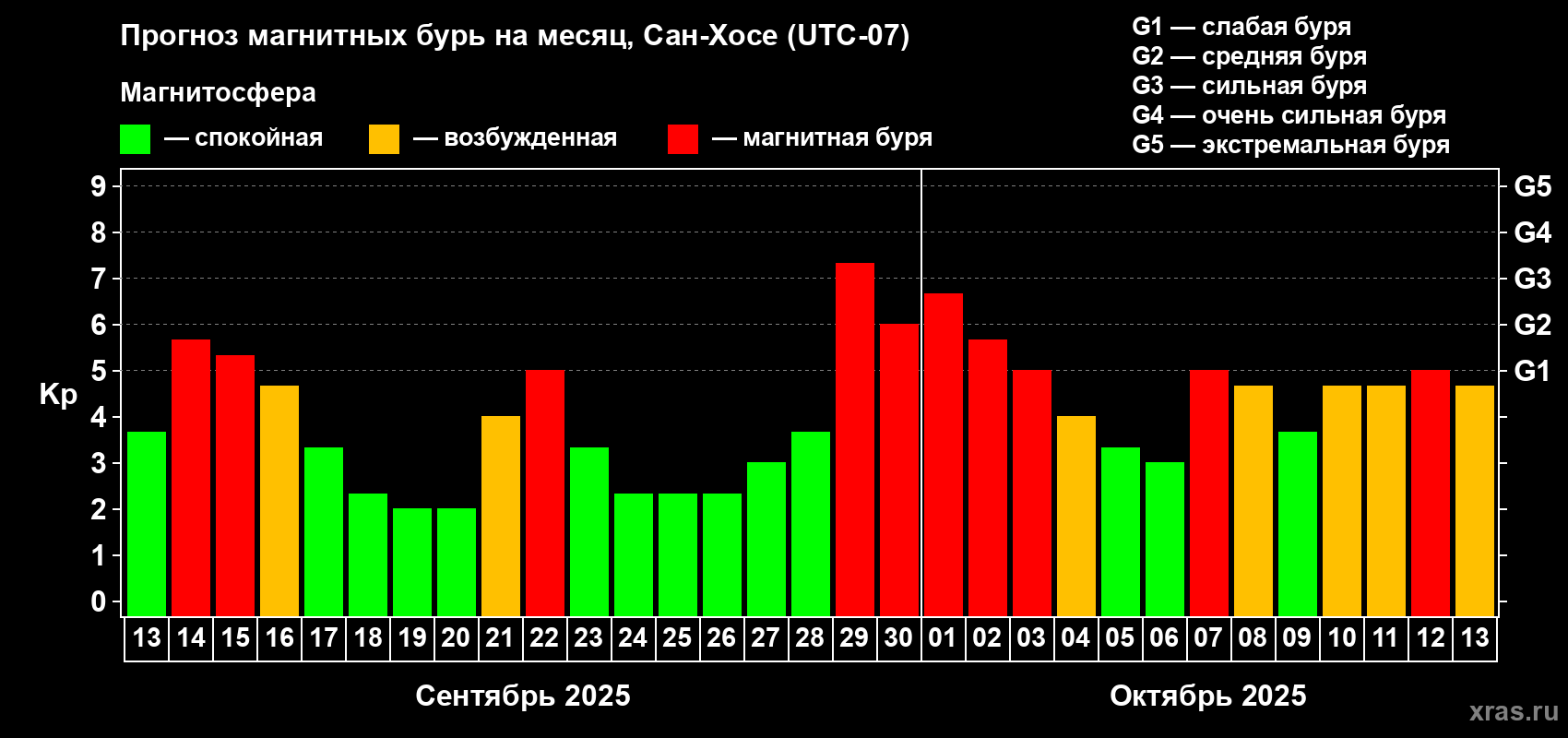 Прогноз магнитных бурь в Сан-Хосе — 13 сентября 2025 года