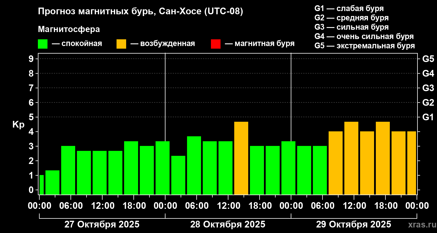 Прогноз магнитных бурь в Сан-Хосе — 27 октября 2025 года