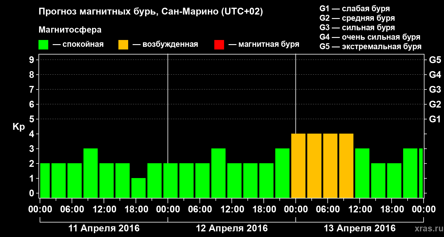 Прогноз магнитных бурь Сан-Марино — 11 апреля 2016 года