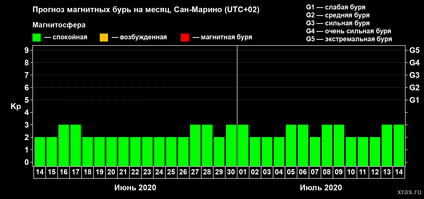 Прогноз магнитных бурь Сан-Марино на 14 июня 2020 года