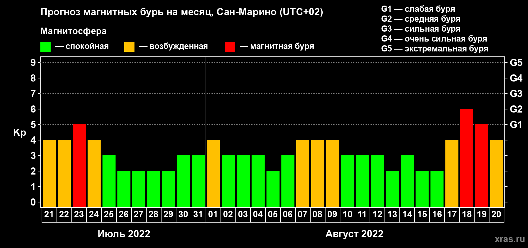 Прогноз магнитных бурь Сан-Марино на 21 июля 2022 года