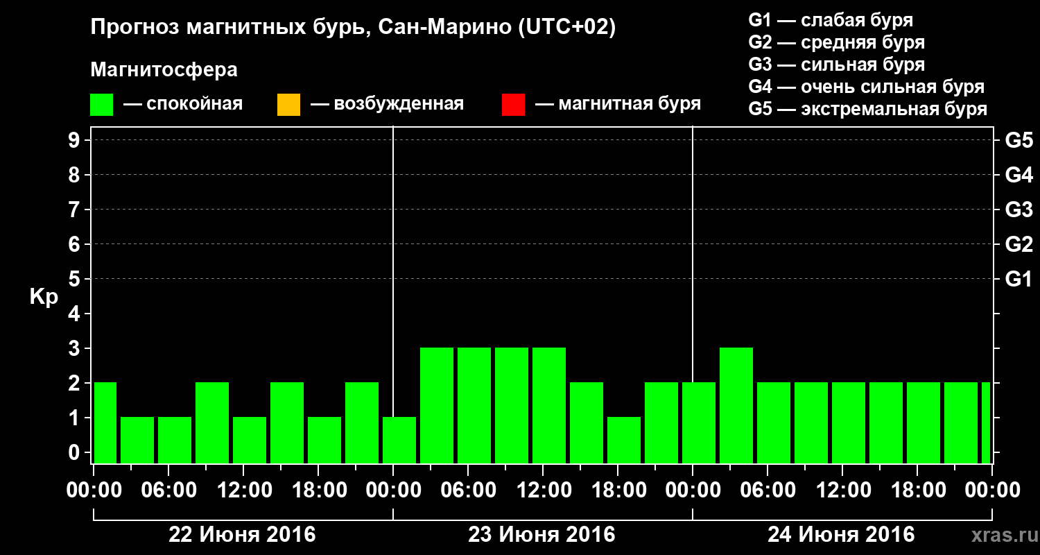 Прогноз магнитных бурь Сан-Марино на 22 июня 2016 года