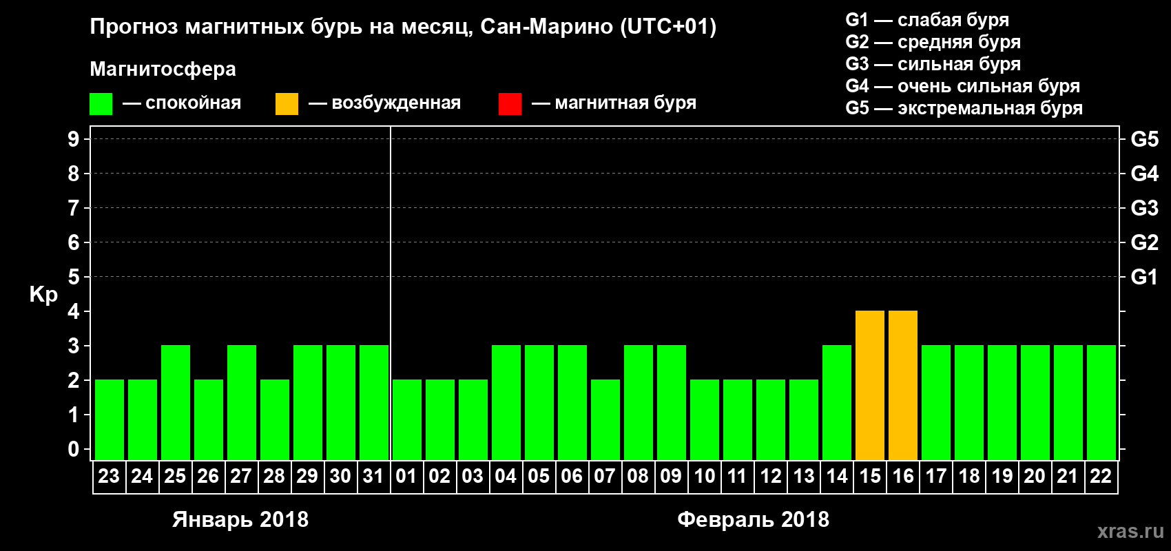 Прогноз магнитных бурь Сан-Марино на 23 января 2018 года