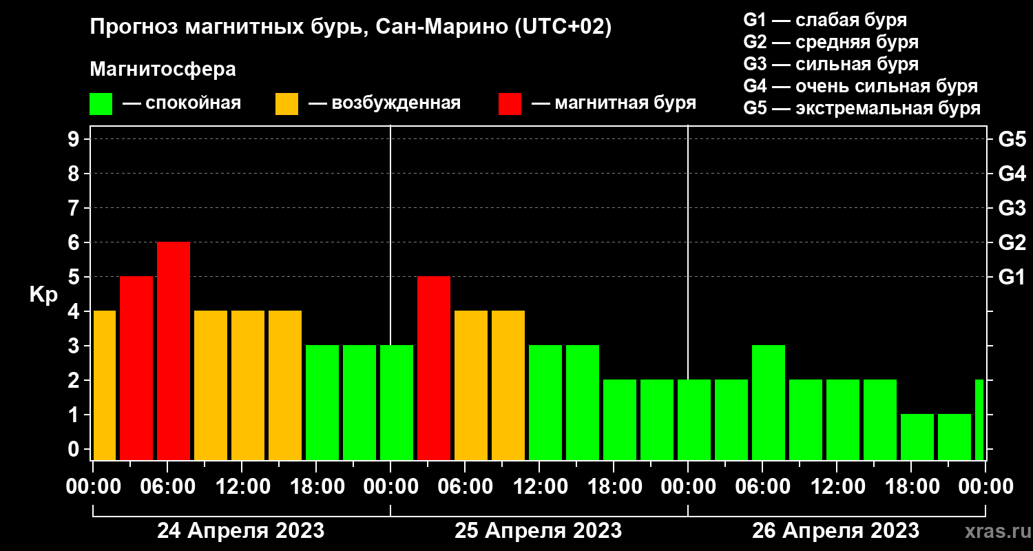 Прогноз магнитных бурь Сан-Марино — 24 апреля 2023 года