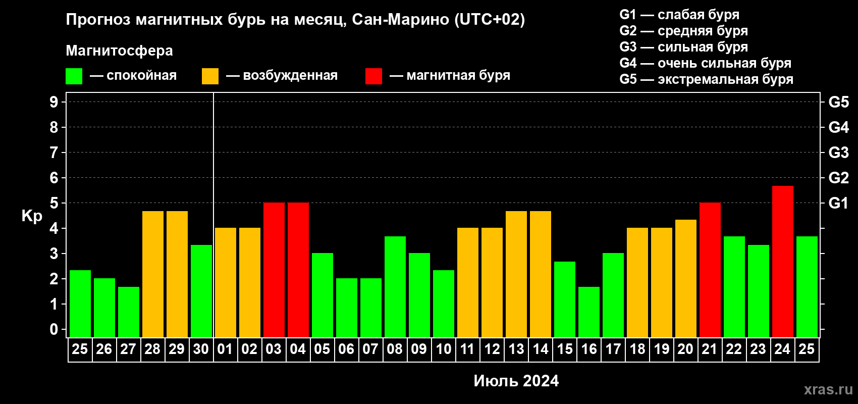 Прогноз магнитных бурь Сан-Марино — 25 июня 2024 года