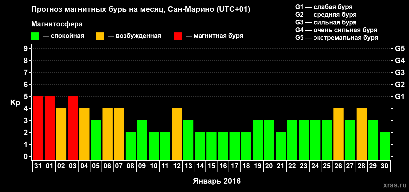 Прогноз магнитных бурь Сан-Марино на 31 декабря 2015 года