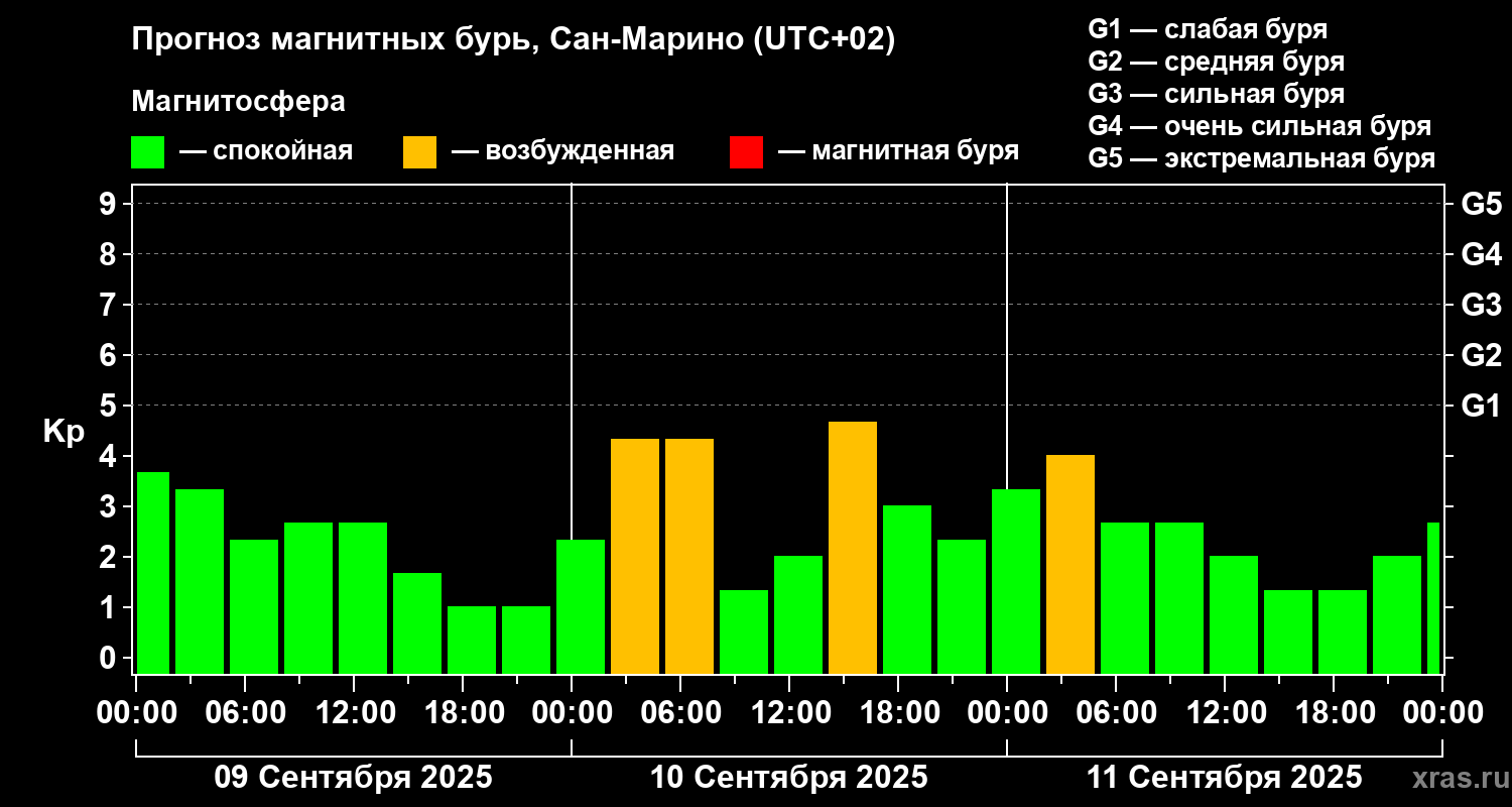 Прогноз магнитных бурь Сан-Марино на 9 сентября 2025 года