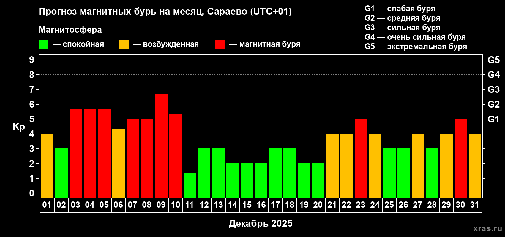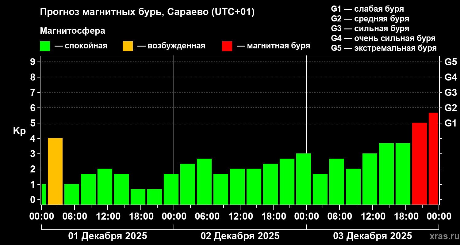Прогноз магнитных бурь Сараево — 1 декабря 2025 года