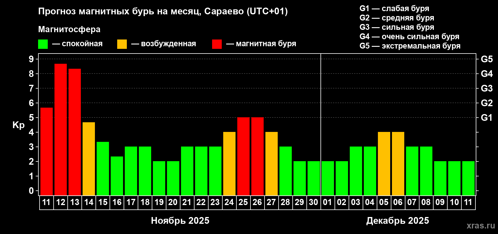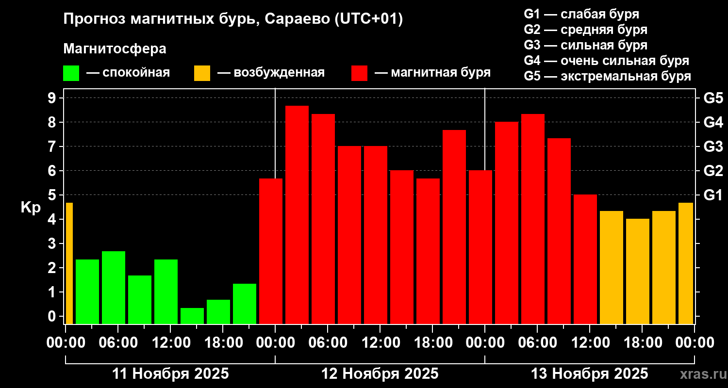 Прогноз магнитных бурь Сараево — 11 ноября 2025 года