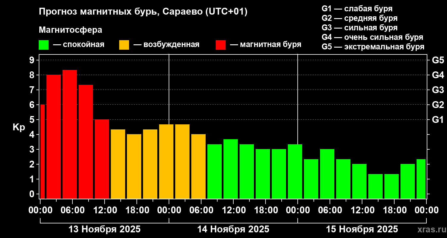 Прогноз магнитных бурь Сараево — 13 ноября 2025 года
