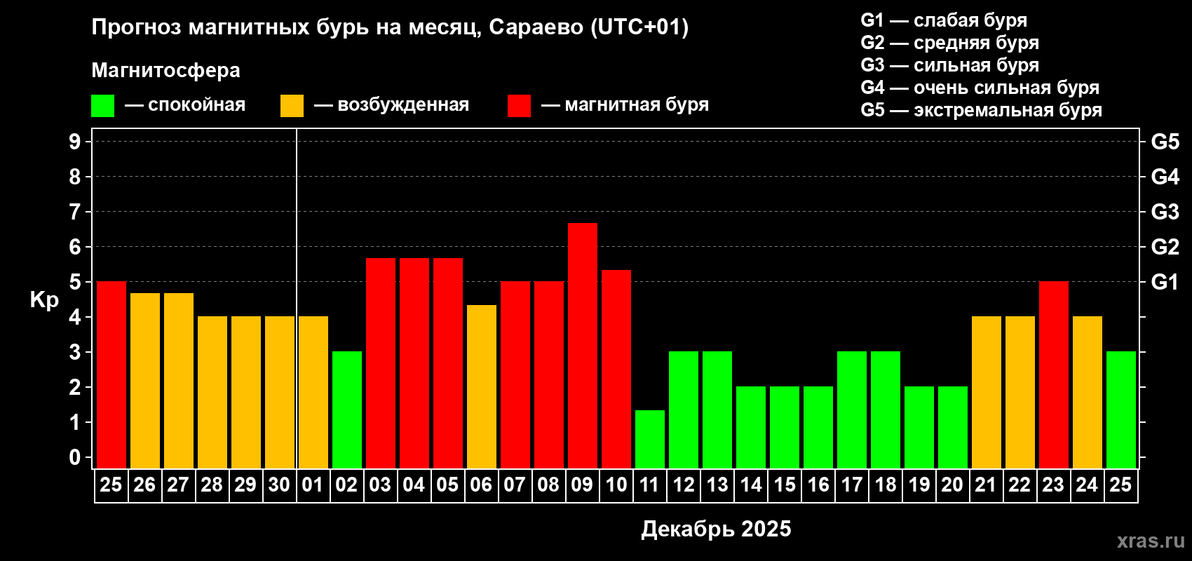 Прогноз магнитных бурь Сараево — 25 ноября 2025 года