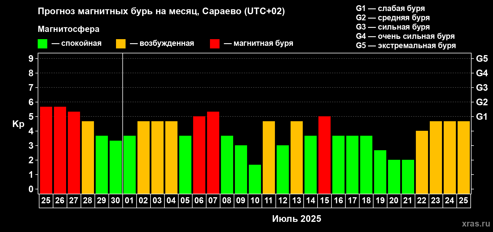 Прогноз магнитных бурь Сараево — 25 июня 2025 года