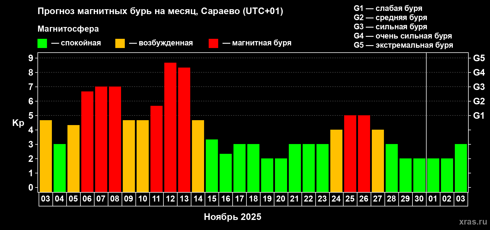 Прогноз магнитных бурь Сараево — 3 ноября 2025 года