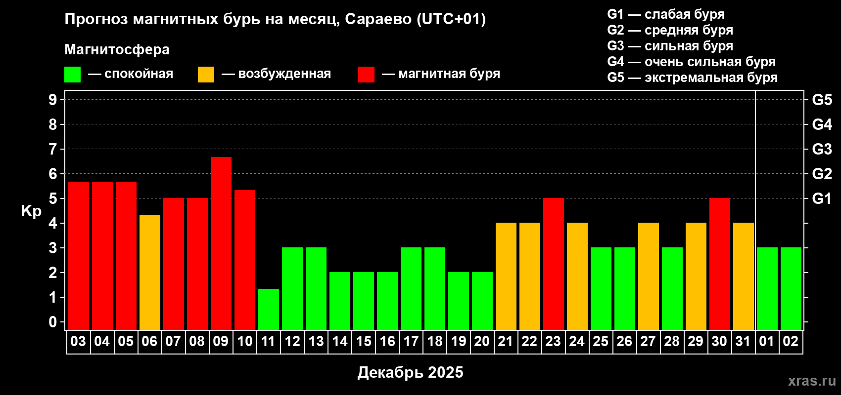 Прогноз магнитных бурь Сараево — 3 декабря 2025 года