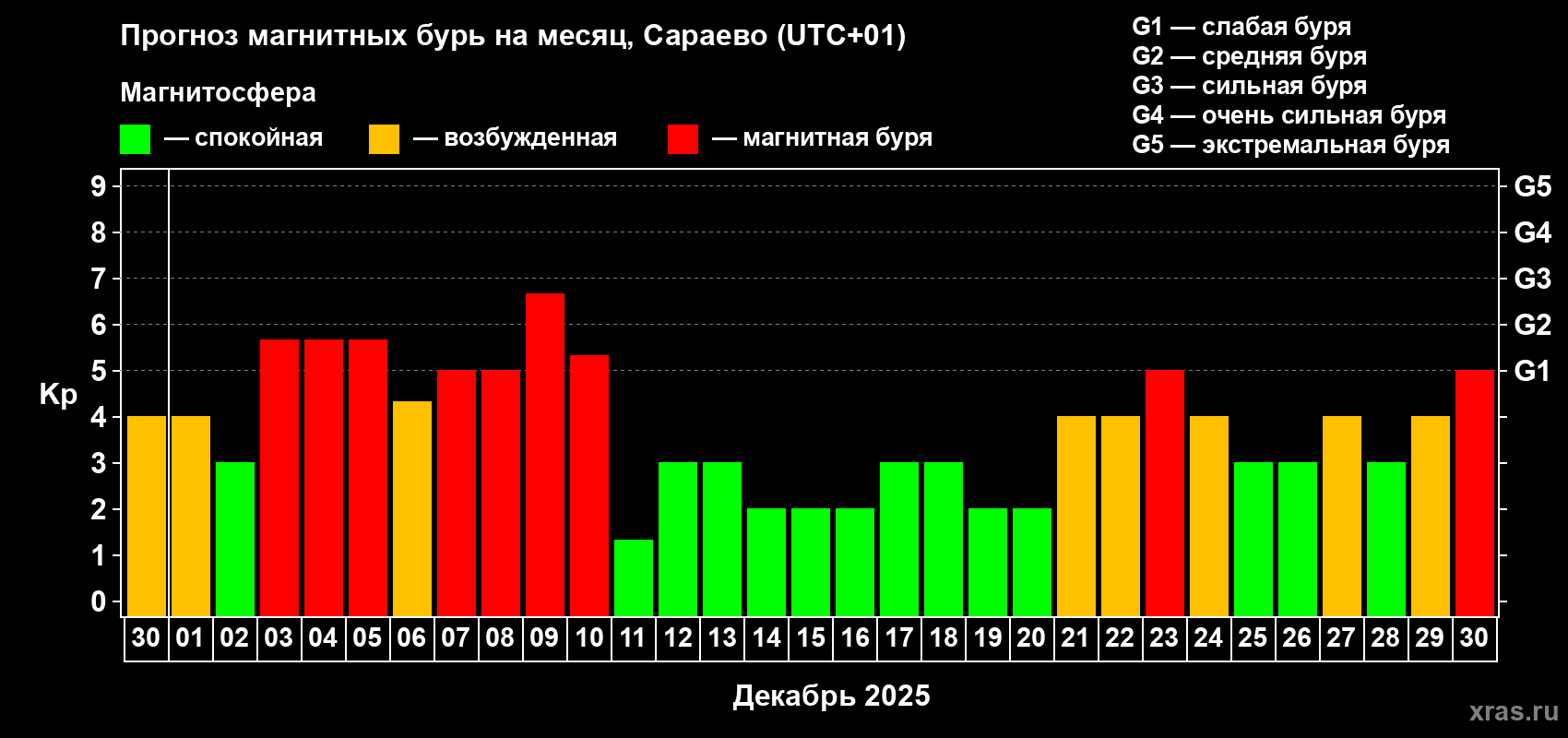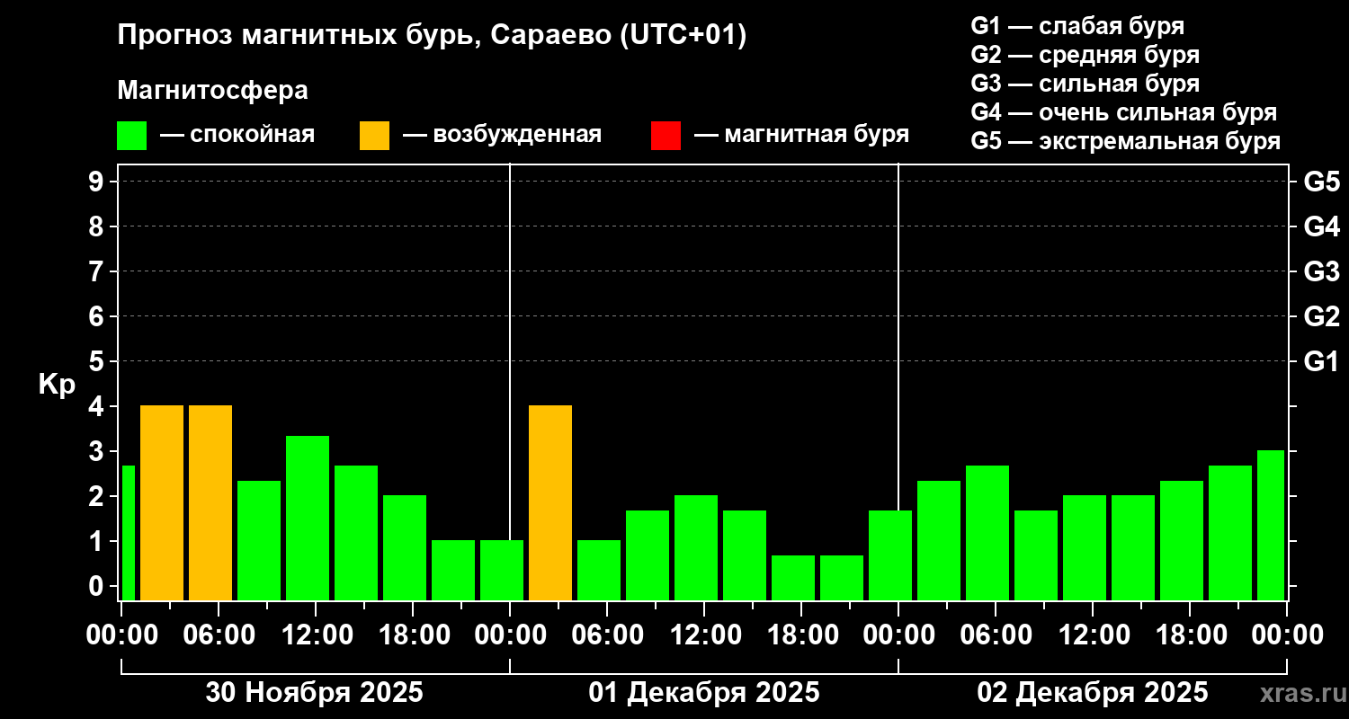 Прогноз магнитных бурь Сараево — 30 ноября 2025 года