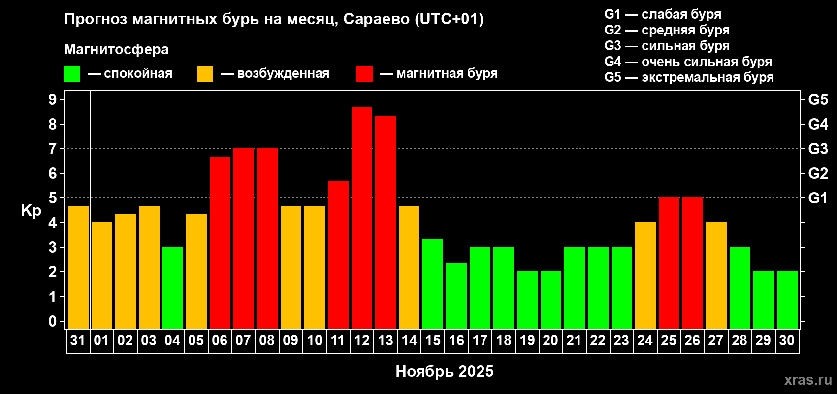 Прогноз магнитных бурь Сараево — 31 октября 2025 года