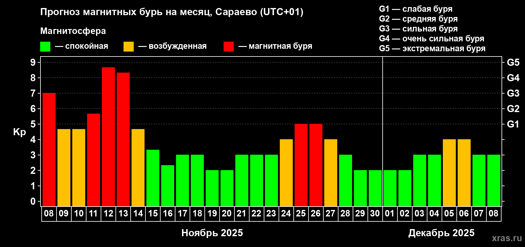 Прогноз магнитных бурь Сараево — 8 ноября 2025 года