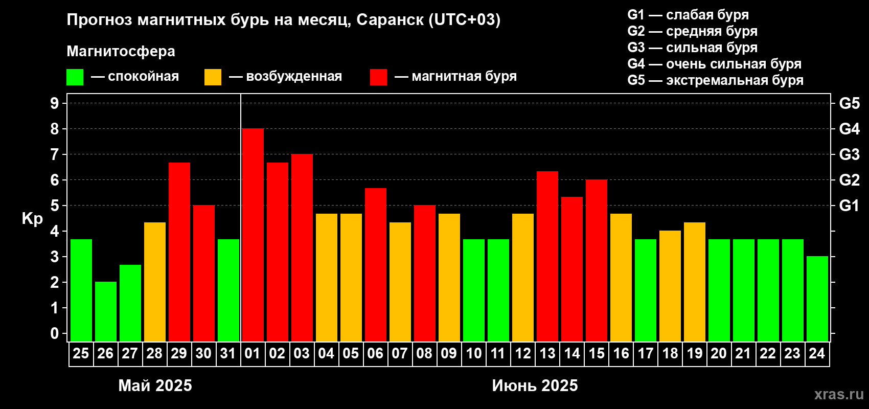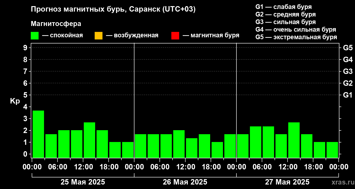 Прогноз магнитных бурь в Саранске на 25 мая 2025 года