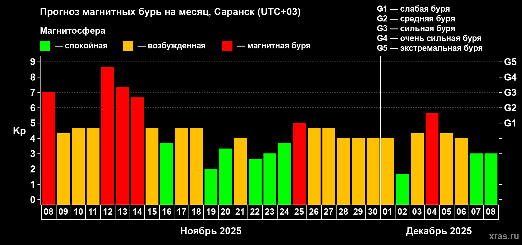 Прогноз магнитных бурь в Саранске — 8 ноября 2025 года