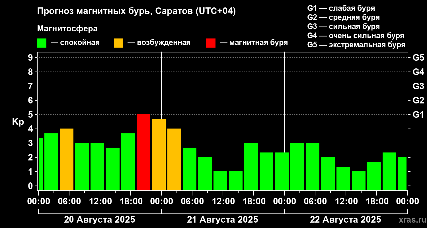 Прогноз магнитных бурь в Саратове — 20 августа 2025 года