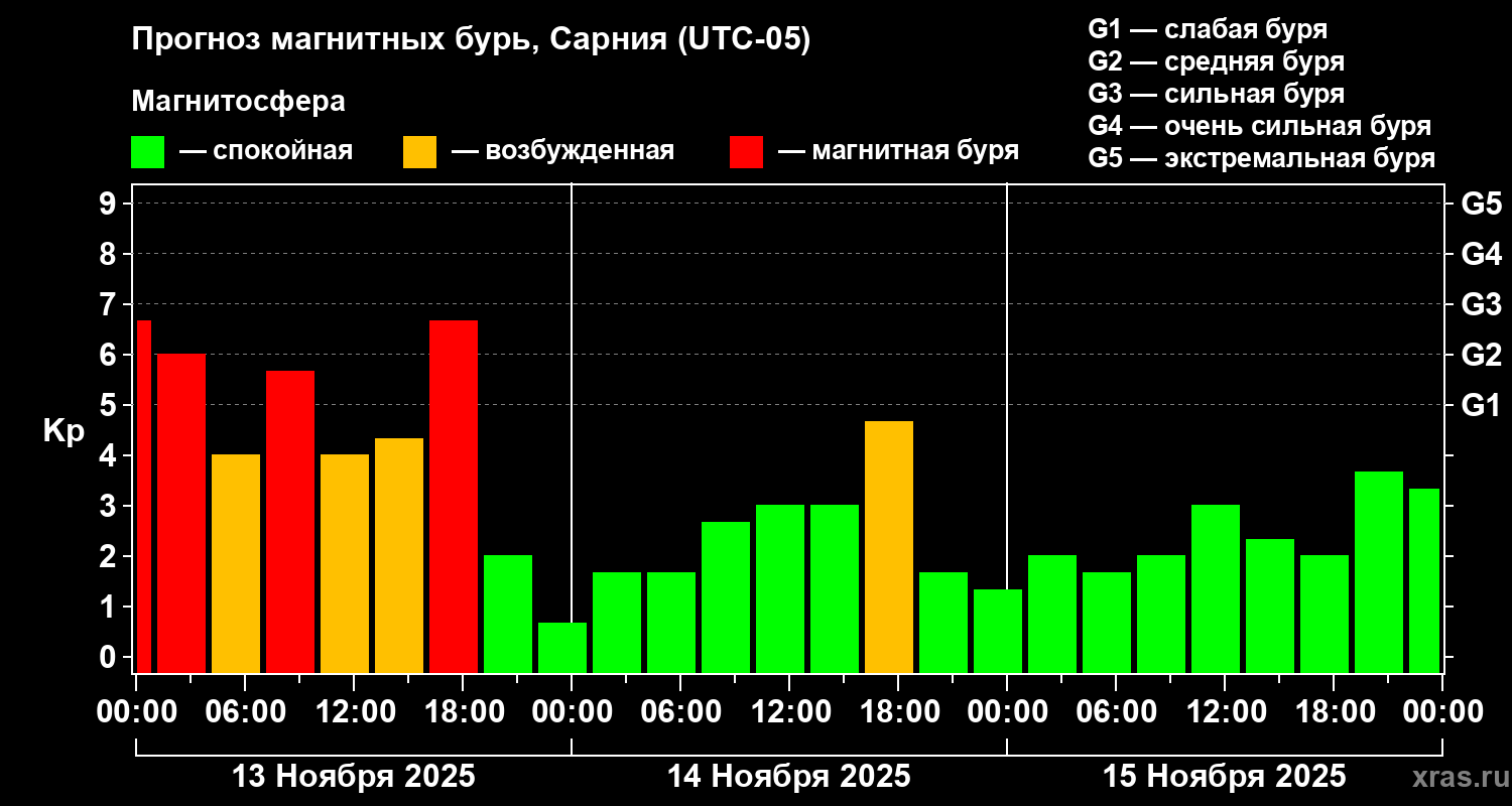 Прогноз магнитных бурь в Сарнии — 13 ноября 2025 года