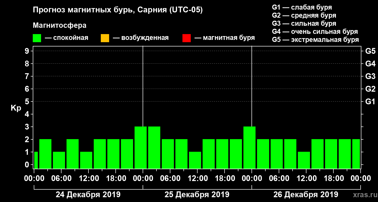 Прогноз магнитных бурь в Сарнии на 24 декабря 2019 года