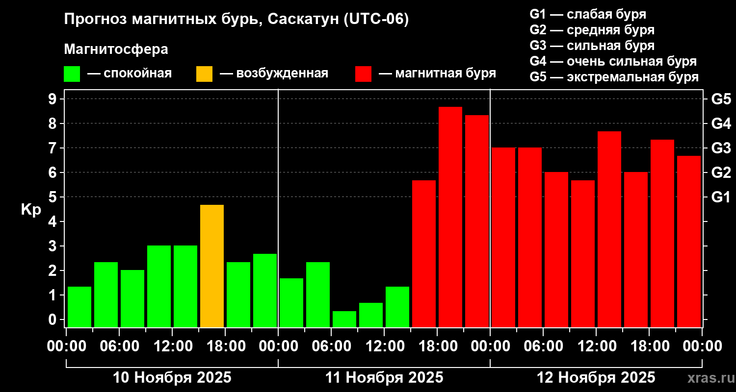 Прогноз магнитных бурь в Саскатуне — 10 ноября 2025 года