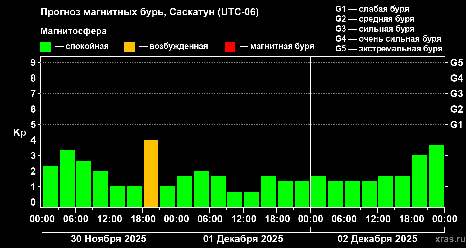Прогноз магнитных бурь в Саскатуне — 30 ноября 2025 года