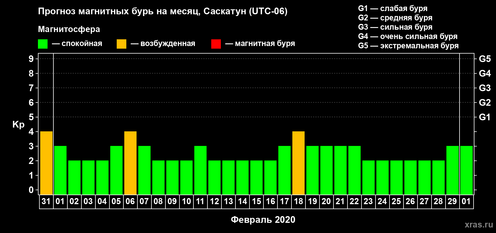 Прогноз магнитных бурь в Саскатуне — 31 января 2020 года