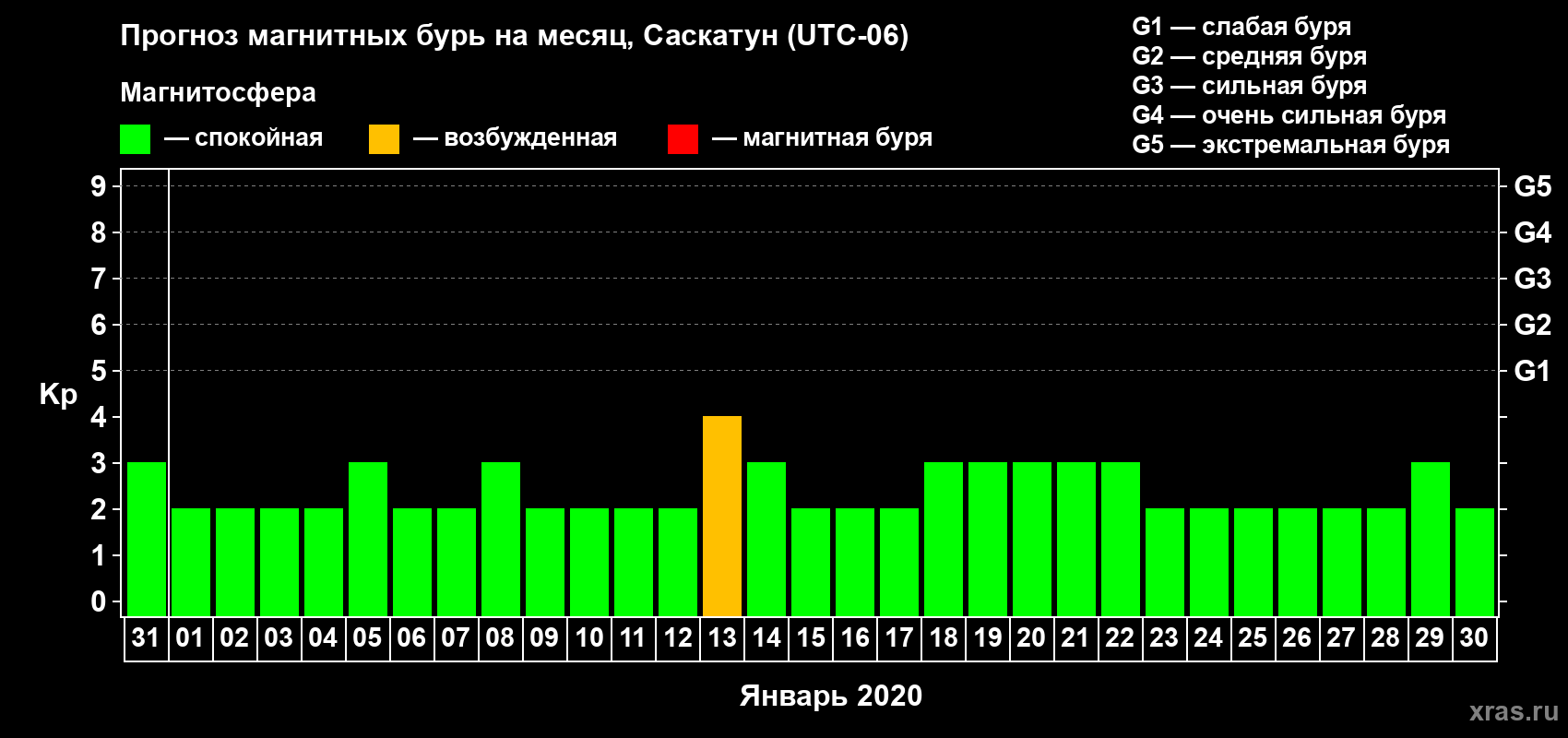 Прогноз магнитных бурь в Саскатуне на 31 декабря 2019 года