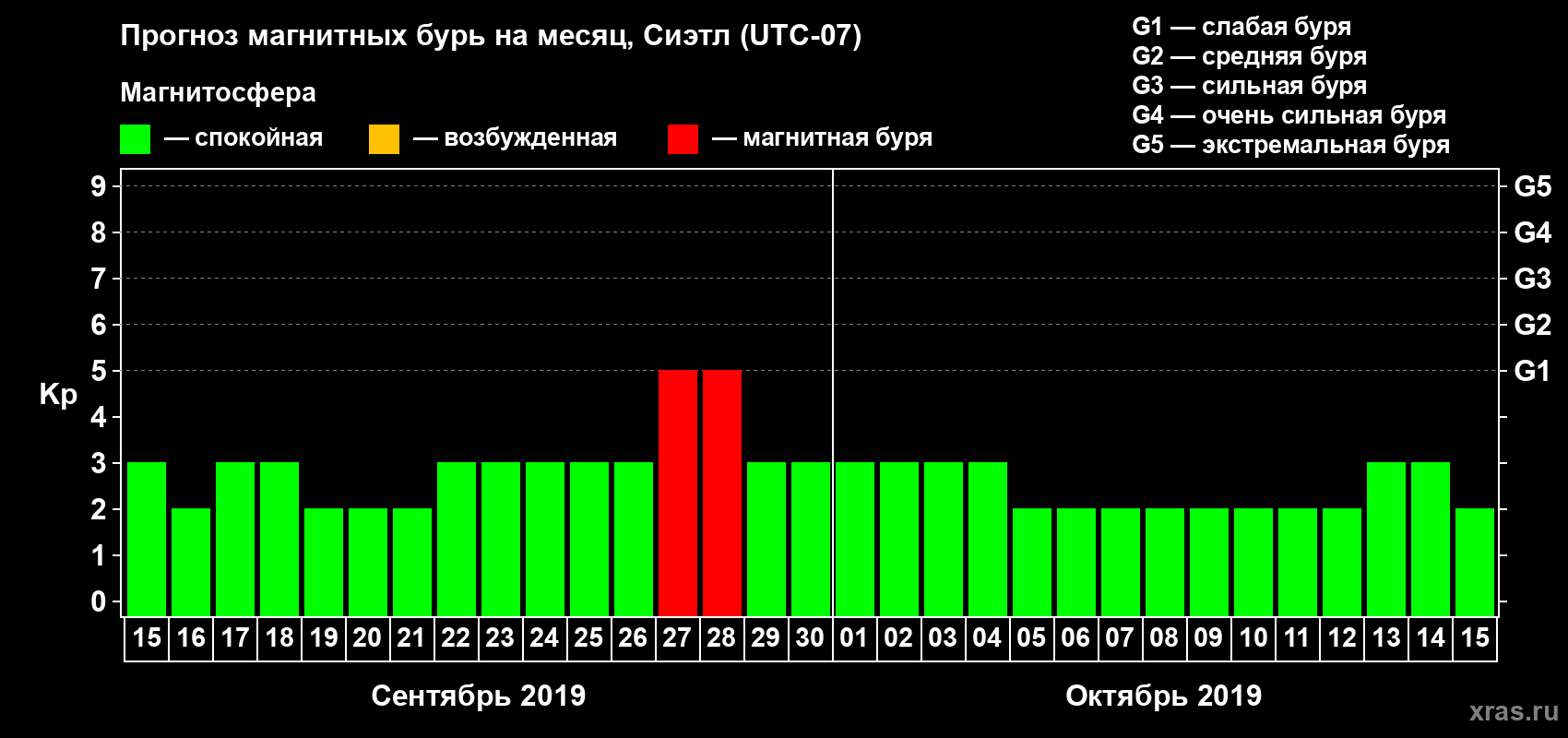 Прогноз магнитных бурь в Сиэтле — 15 сентября 2019 года