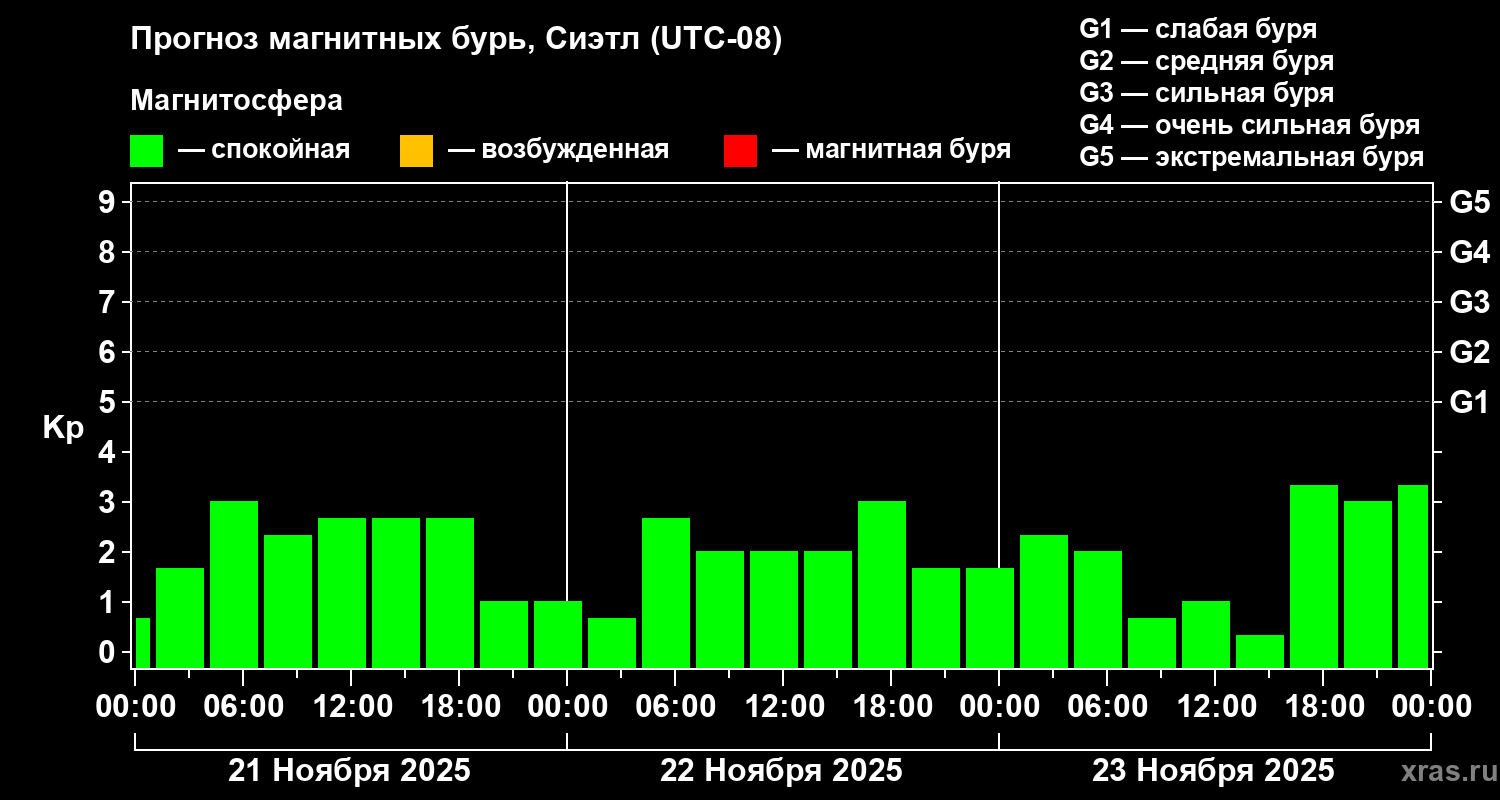 Прогноз магнитных бурь в Сиэтле — 21 ноября 2025 года
