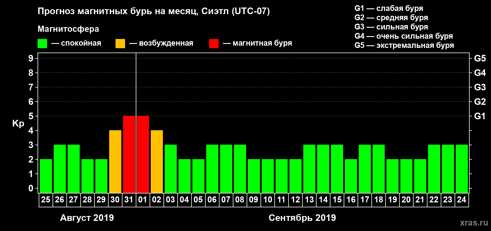 Прогноз магнитных бурь в Сиэтле — 25 августа 2019 года