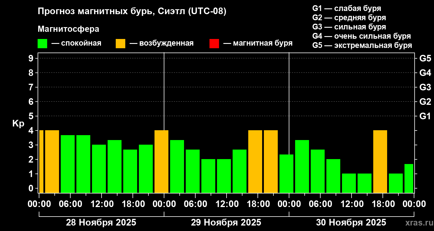 Прогноз магнитных бурь в Сиэтле — 28 ноября 2025 года
