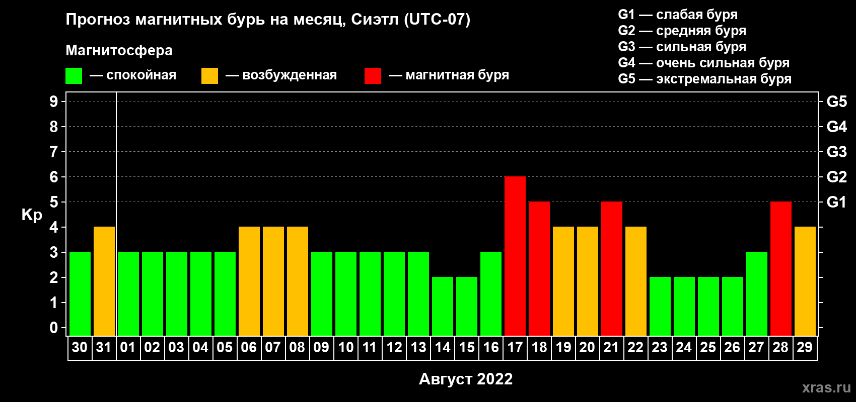 Прогноз магнитных бурь в Сиэтле — 30 июля 2022 года