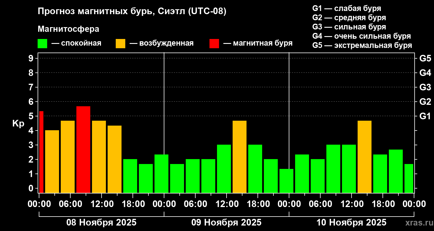 Прогноз магнитных бурь в Сиэтле — 8 ноября 2025 года