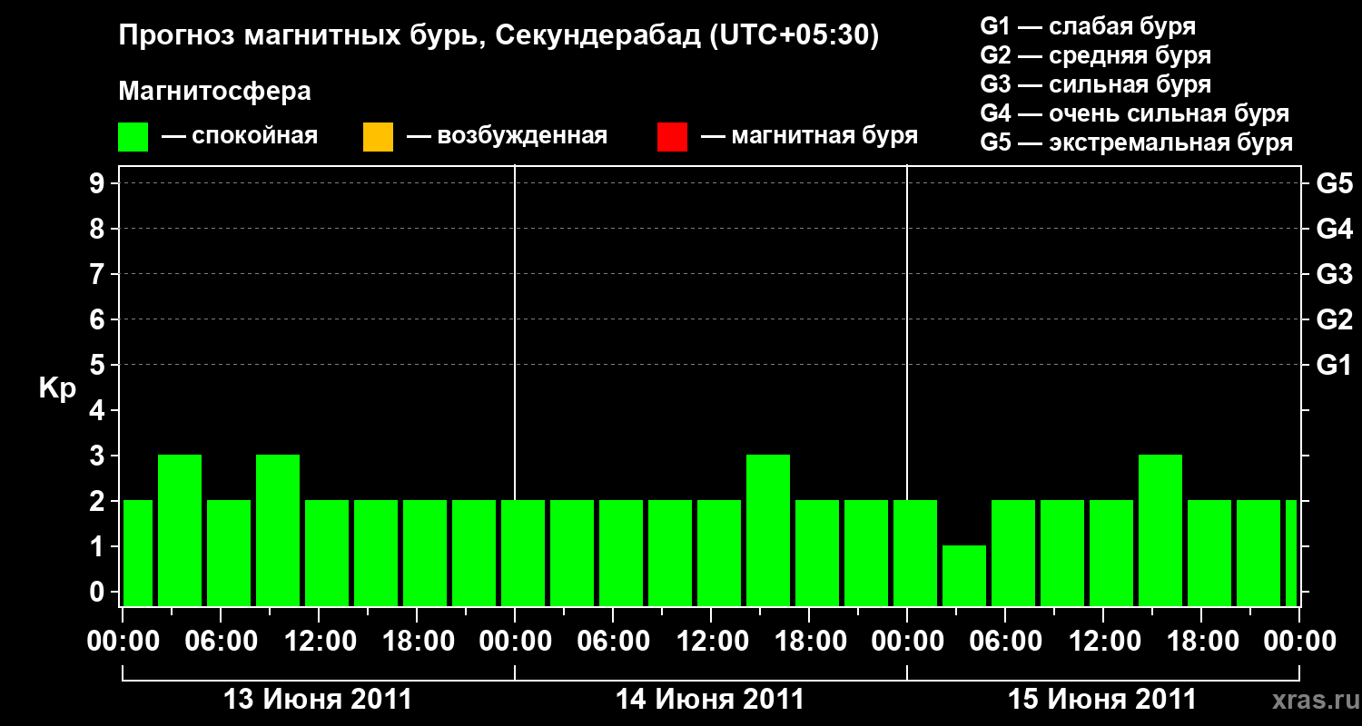 Прогноз магнитных бурь в Секундерабаде — 13 июня 2011 года