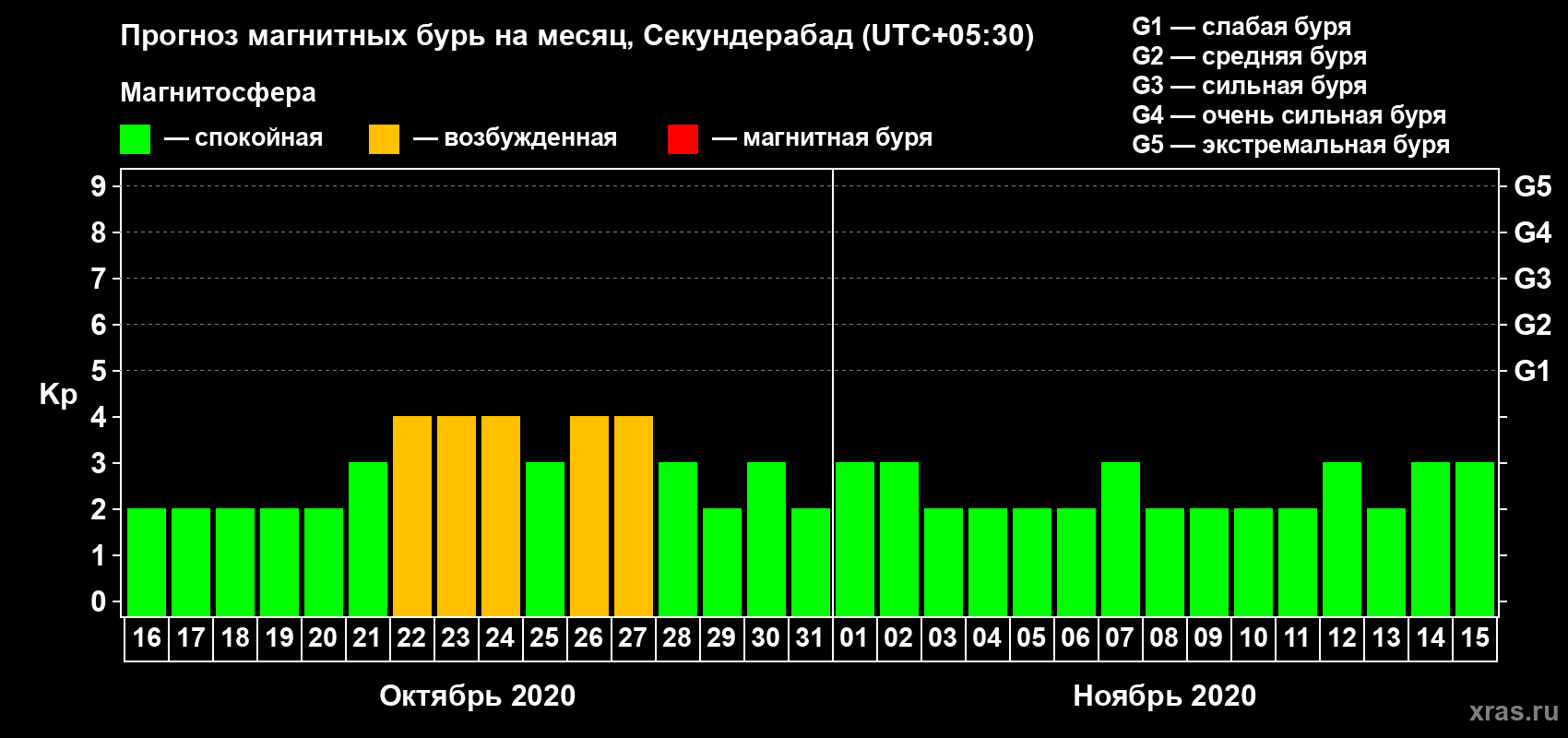 Прогноз магнитных бурь в Секундерабаде — 16 октября 2020 года