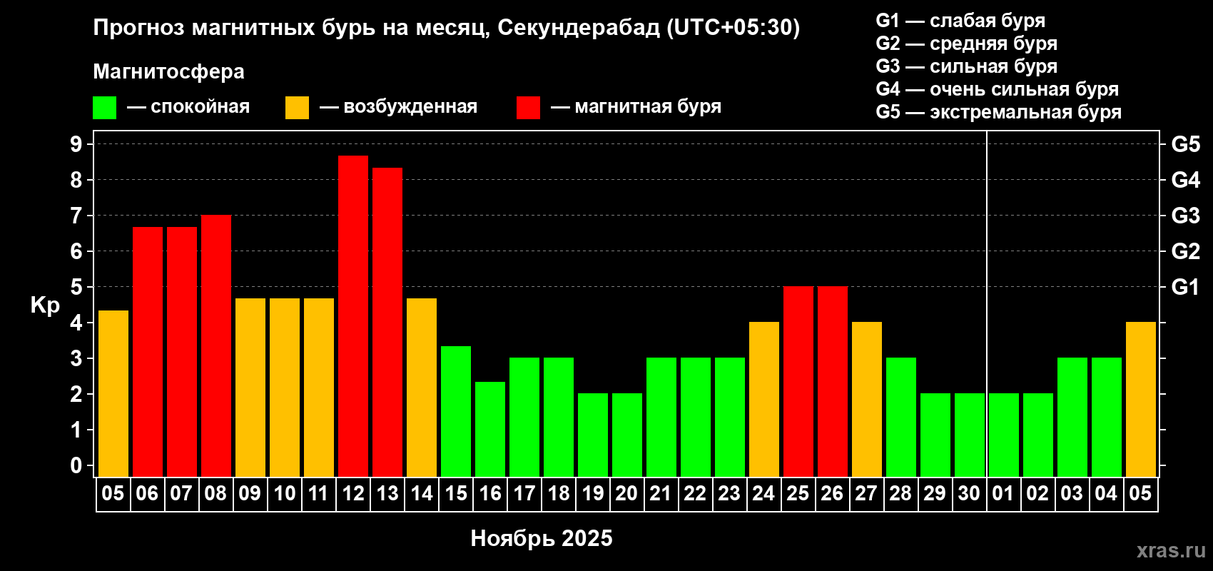 Прогноз магнитных бурь в Секундерабаде — 5 ноября 2025 года