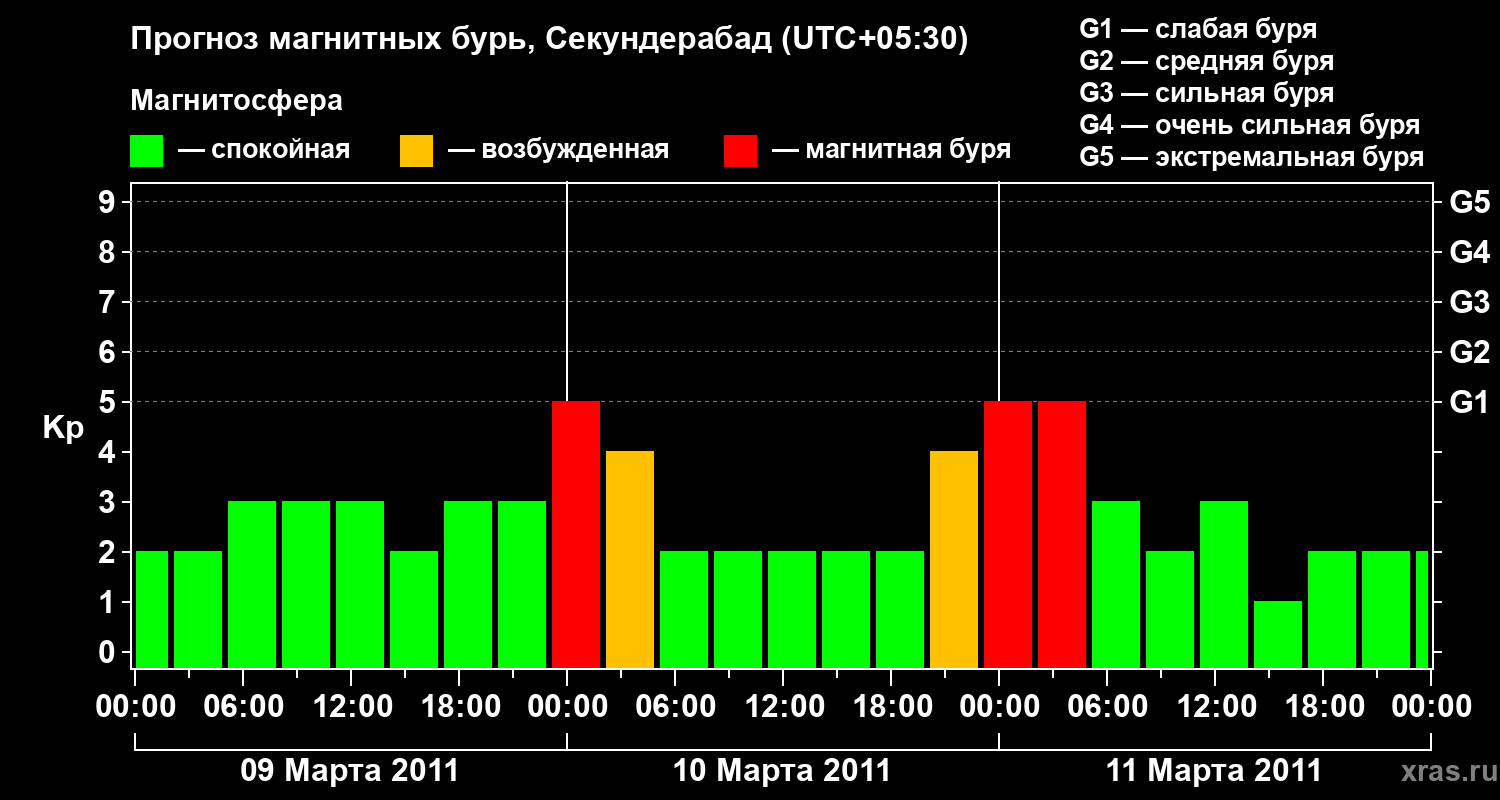 Прогноз магнитных бурь в Секундерабаде — 9 марта 2011 года