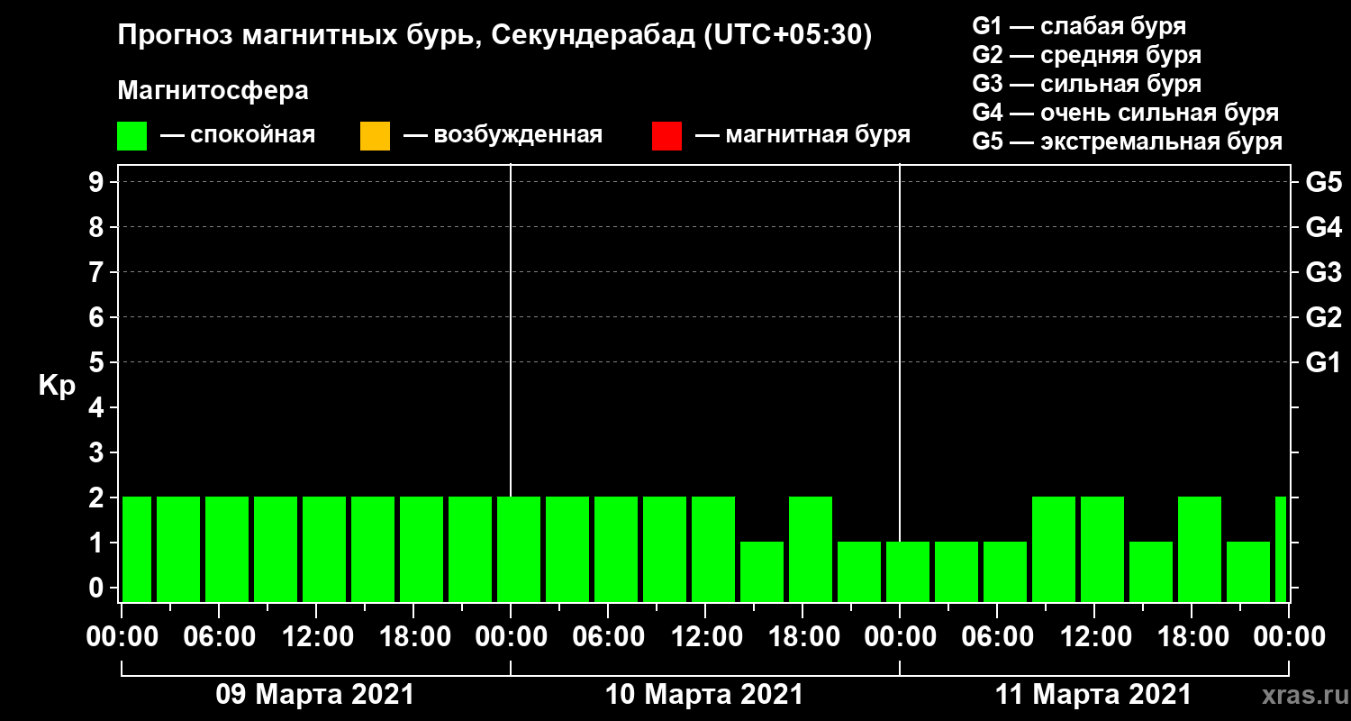 Прогноз магнитных бурь в Секундерабаде — 9 марта 2021 года