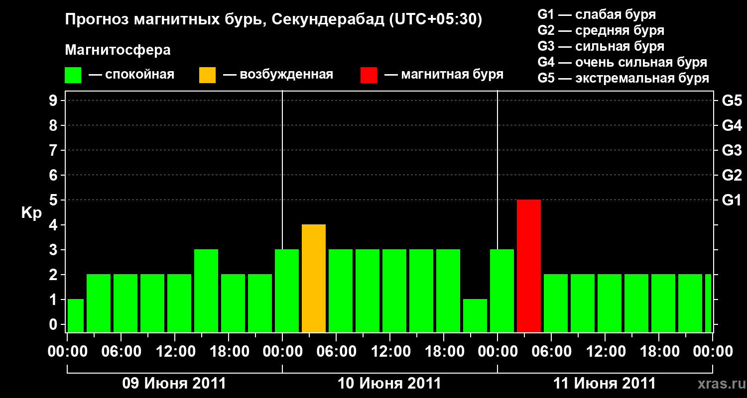 Прогноз магнитных бурь в Секундерабаде — 9 июня 2011 года