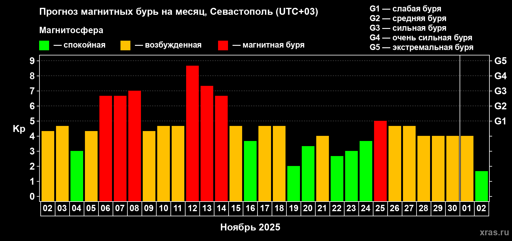 Прогноз магнитных бурь в Севастополе — 2 ноября 2025 года