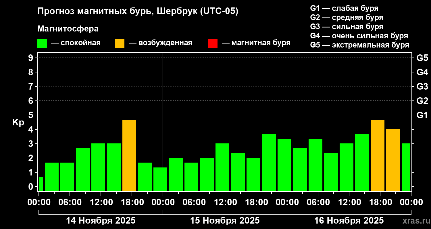 Прогноз магнитных бурь в Шербруке — 14 ноября 2025 года